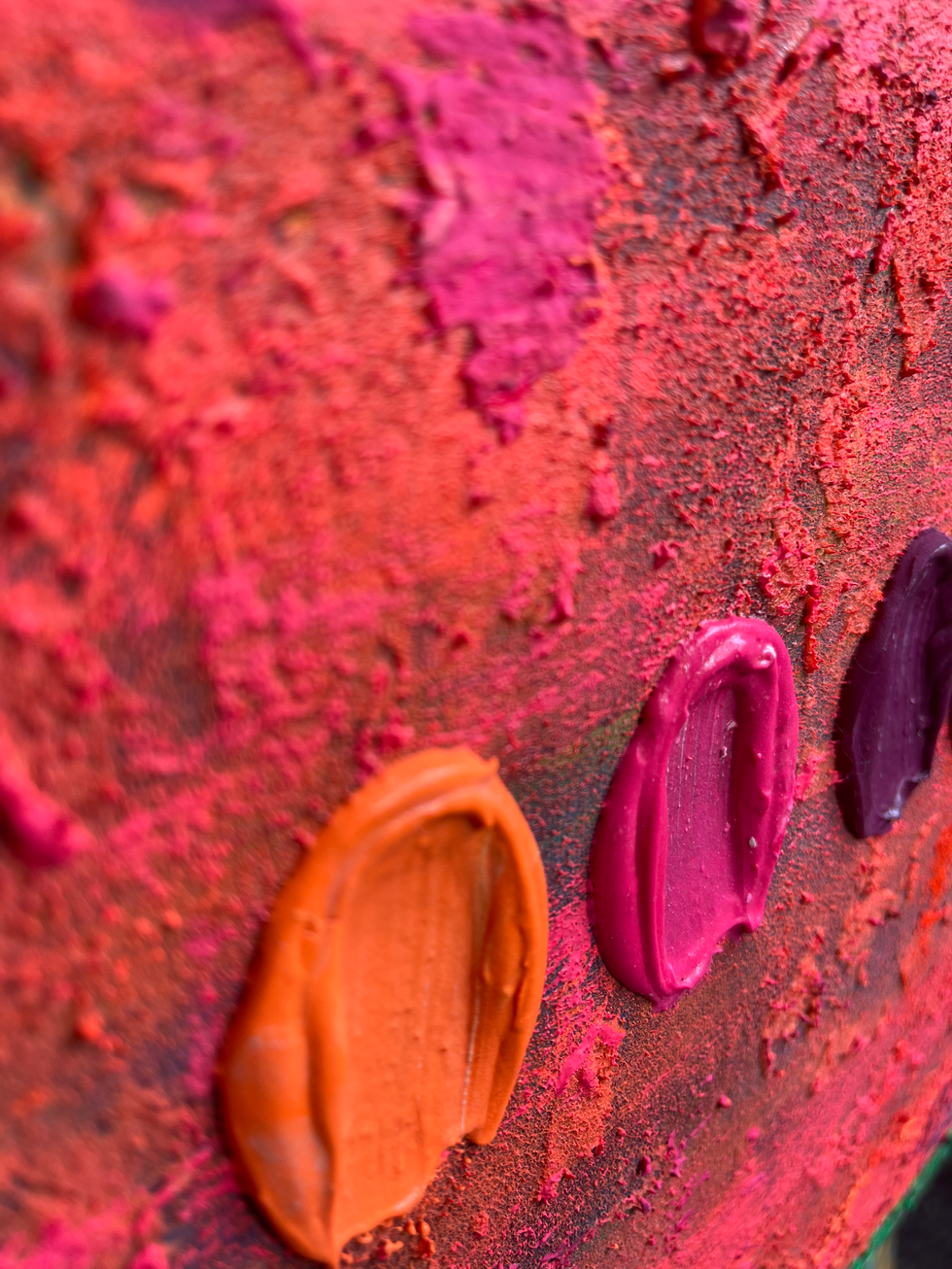 The series Gloss Echo Layer thrives on the tension between control and chance. Bold brushstrokes meet layers of heavy gloss gel, reflecting colors like an echo. The characteristic splashes protrude from the canvas as tactile memories, while quartz sand embodies the transience of time and earthy depth. The massive, restless surfaces invite the viewer to perceive the painting almost physically. Light becomes a co-painter, the work reveals itself anew with every change of the day and challenges the viewer in a constant dialogue.